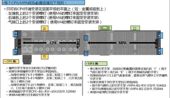 1. 氣接口上的安裝孔(pneumatic interface);2. 左右兩側端板上的安裝孔(end plates);3. CPX電終端的安裝支架(Interlinking Block);4. 閥島上的安裝支架,添加閥島的輔助安裝支架要考慮到整個閥島的安裝位置以及所受的震動強度,避免閥島因為安裝不當而損壞。